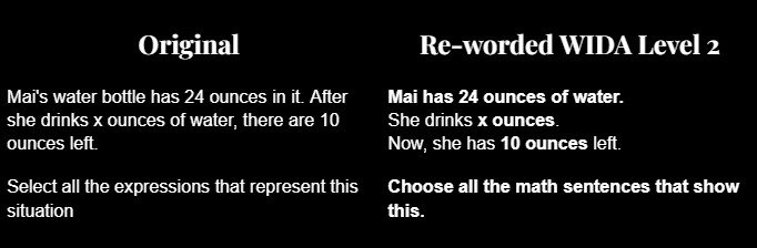 Prompt: Reword this math instruction for a multilingual learner at WIDA Level 2: [insert instructions]