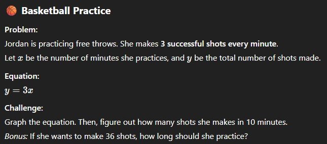 Prompt: “I’m teaching about graphing linear equations to 8th graders. Three students love sports. Create word problems that connect to this interest.”