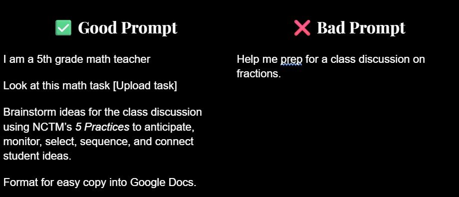 • Aim – What you want AI to do (e.g., brainstorm, adapt, generate problems).